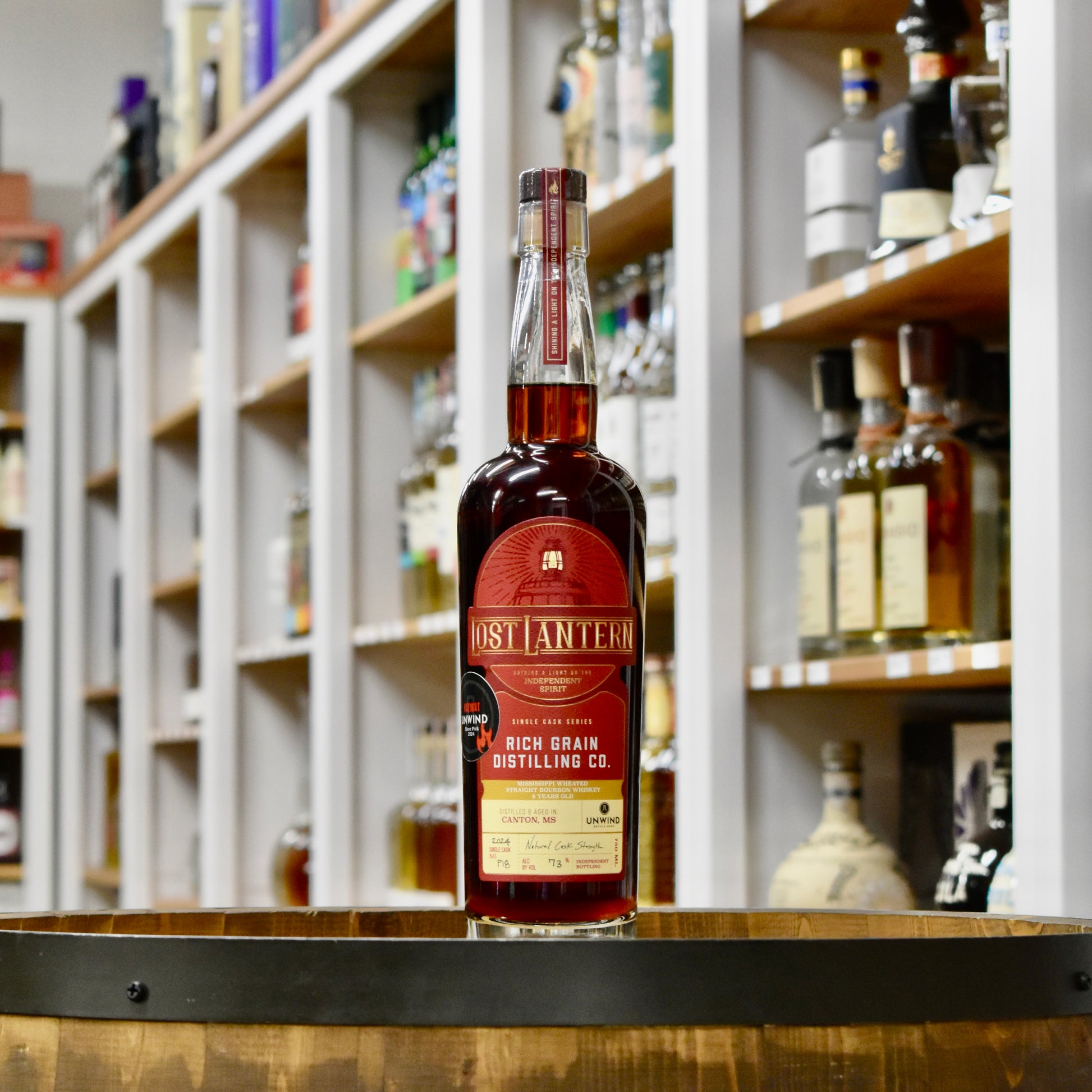 Lost Lantern hand-selected this cask from Rich Grain Distilling in Canton, Mississippi. David Rich founded the distillery to create a whiskey that reflected mississippi's hot, humid climate. Although the distillery closed in 2020, its whiskey continued to age in Mississippi, and it has achieved that original vision: a true Mississippi bourbon, born of the deep south, aged for 8 years in a 30-gallon cask, this was made from 66% mississippi-grown corn. 17% wheat, and 17% malted barley. The nose has hints of maple syrup, cinnamon, and rich leather. The extremely rich palate has notes of ginger molasses cookies and intensely dark chocolate. A powerful and decadent dram.